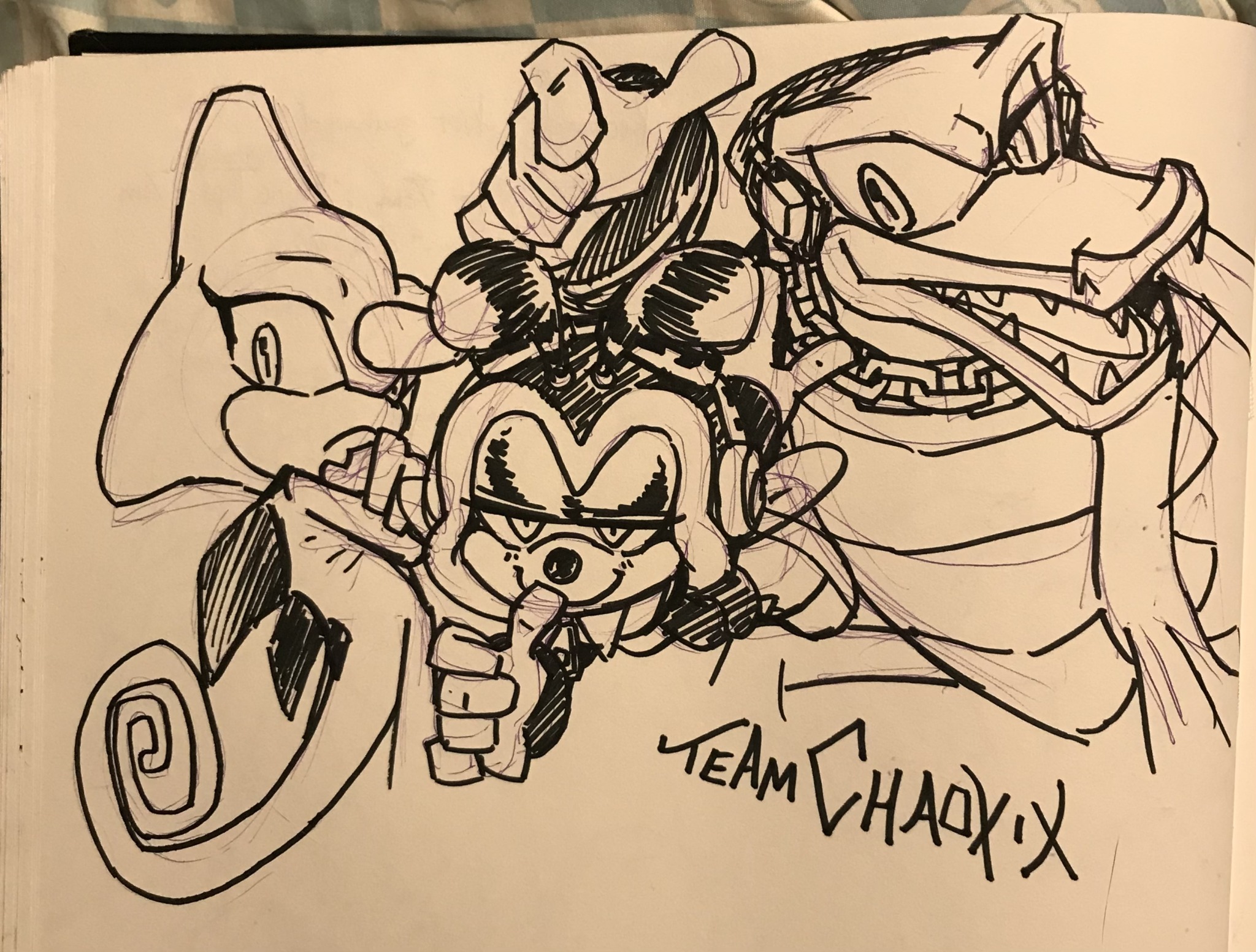 safe35036 artist:montydrswsstuff12 charmy bee448 espio the chameleon745 vector the crocodile279 20252597 arms folded564 flying1200 frown4334 lidded eyes3715 line art1513 looking at viewer7519 mid-air704 monochrome1827 penwork23 smile12932 standing9962 team chaotix92 text495 thumbs up357 traditional media1513 trio1618