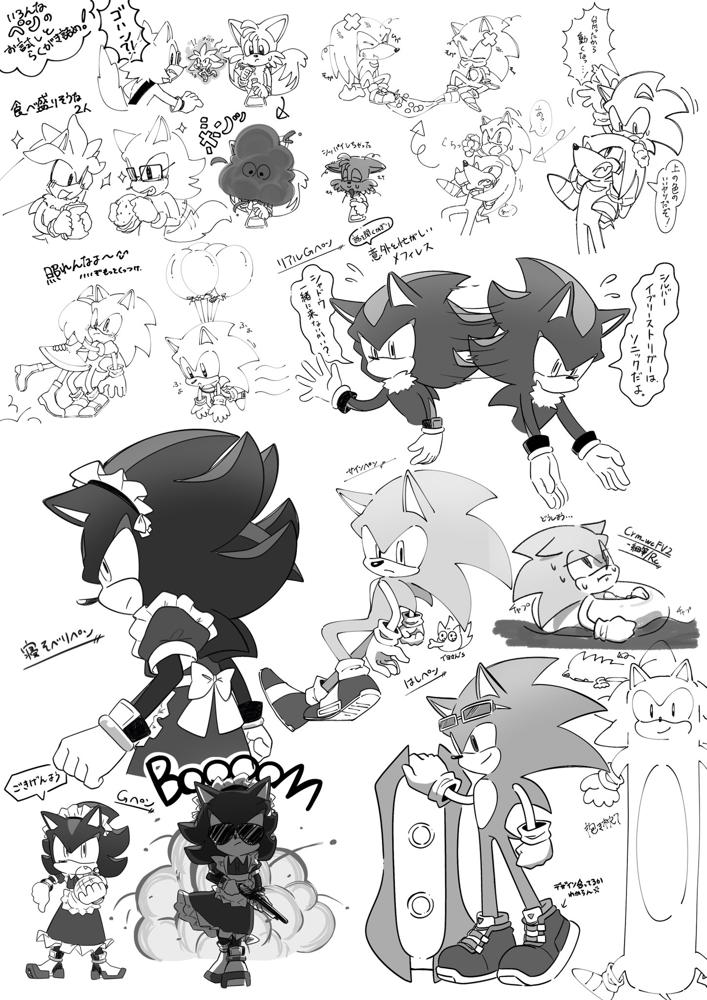 safe36724 artist:oudooooon42795 amy rose5710 gadget the wolf219 knuckles the echidna2250 mephiles the dark173 miles "tails" prower9086 shadow the hedgehog6110 silver the hedgehog1877 sonic the hedgehog13327 20253418 balloon29 classic sonic985 crossdressing155 dress759 extreme gear229 greyscale889 group1334 gun320 holding something3337 hugging1209 inner tube5 japanese text420 maid outfit39 monochrome2099 riders outfit87 simple background14971 sketch1809 sketch page39 smile13731 sonic riders360 speech bubble1365 standing10530 sunglasses464 water450 white background7328