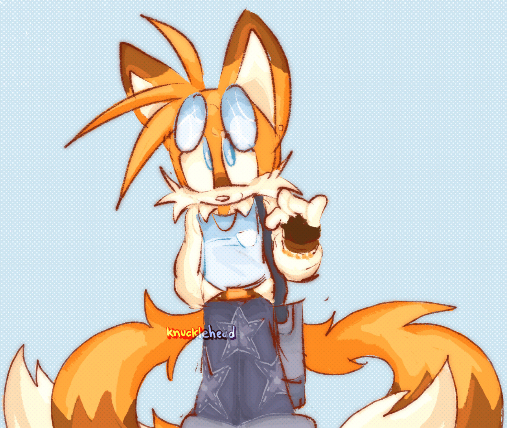 safe37111 artist:knuckie-head10 miles "tails" prower9193 2026118 alternate outfit1139 bag154 blue background706 clothes1655 cute5644 eyewear on head79 fur markings202 glasses407 hand in pocket97 jeans48 shirt724 signature6062 simple background15211 smile13922 solo16939 standing10678 vest45