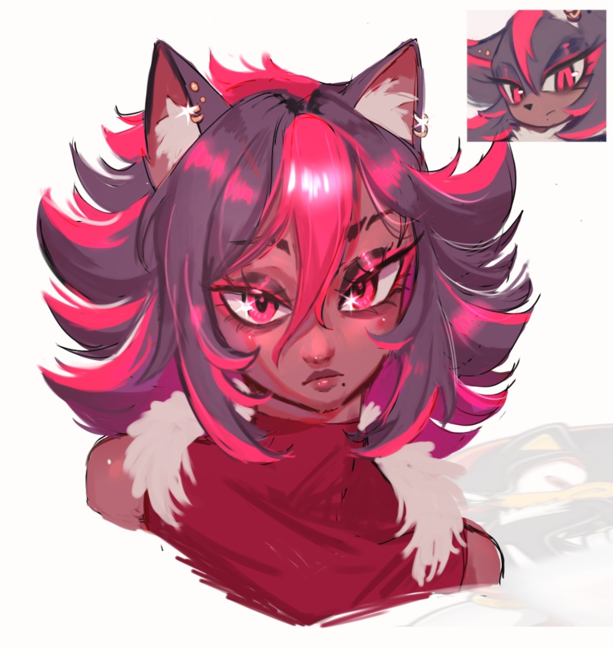 safe37246 artist:saintforan13 shadow the hedgehog6210 human2103 20253620 bust364 clothes1680 dark skin368 ear fluff725 ear piercing363 earring370 eyelashes1110 eyeshadow125 female6186 frown4617 gender swap957 humanized753 lineless532 looking offscreen4297 partially humanized278 reference inset508 scarf537 simple background15294 solo16993 species swap218