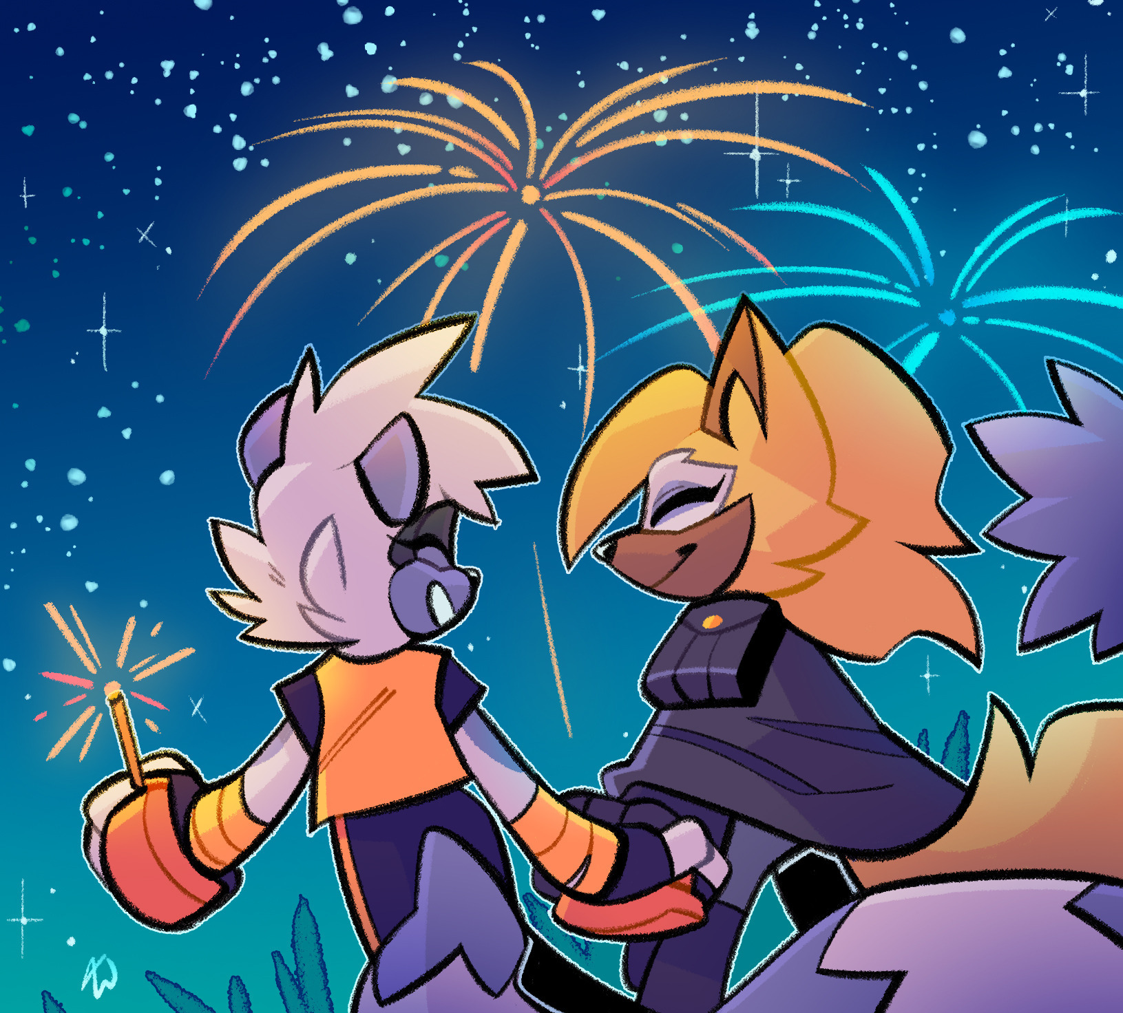 safe37246 artist:mintywhisker9 tangle the lemur1096 whisper the wolf1124 lemur246 wolf407 20201013 abstract background7017 duo12287 eyes closed4675 female6186 fireworks27 holding hands1609 holding something3454 new years46 nighttime506 outdoors1568 outline1797 smile13993 sparkler11 star (sky)454 walking554