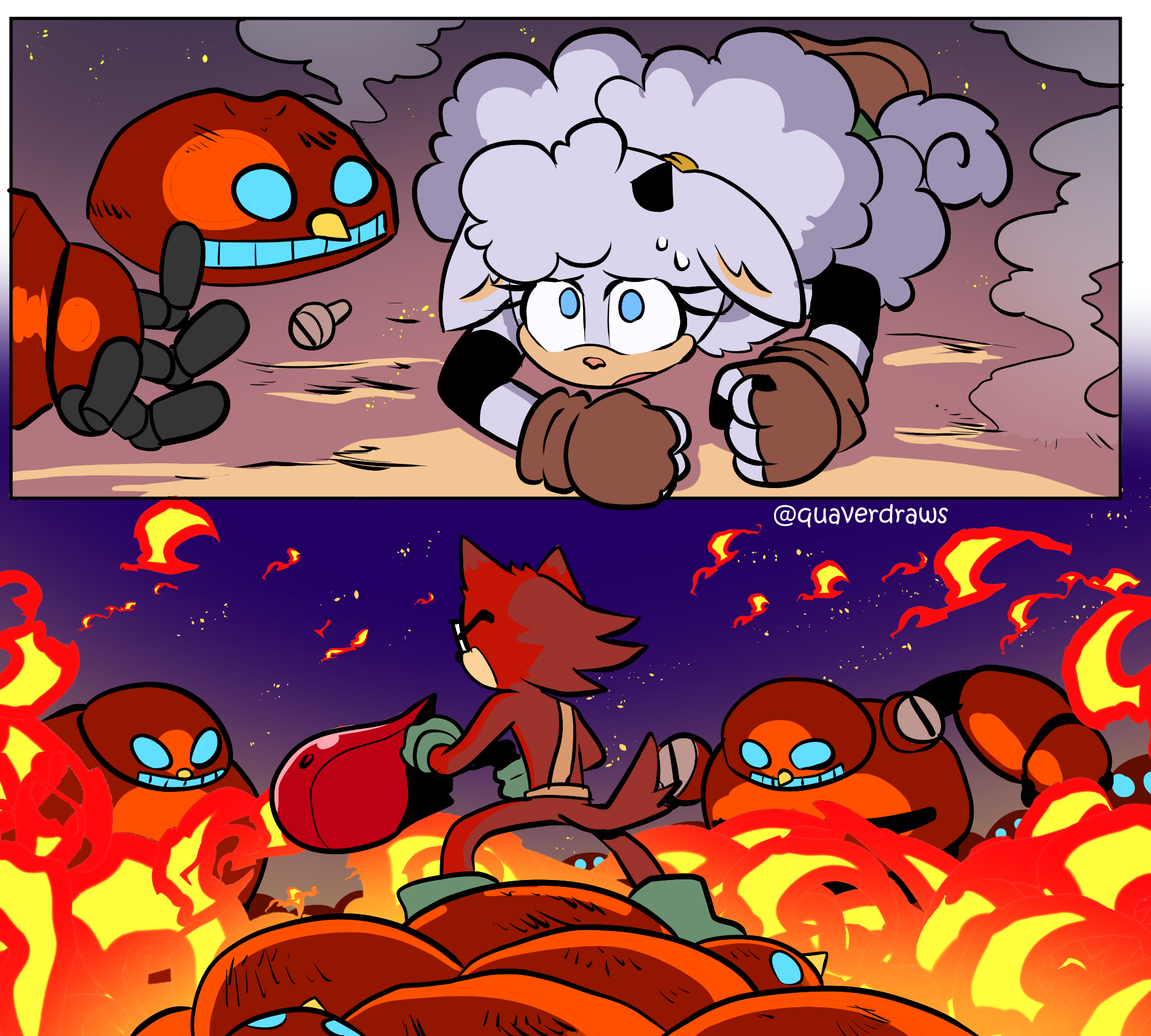 safe37493 artist:quaverdraws22 gadget the wolf240 lanolin the sheep168 sheep67 wolf435 20253698 comic768 destroyed robot3 duo focus100 female6264 fight154 fighting12 fire345 gadget x lanolin21 glasses425 group1375 looking at them2173 male6647 nighttime511 shipping9901 straight1486 sweatdrop1177 weapon127 wispon54
