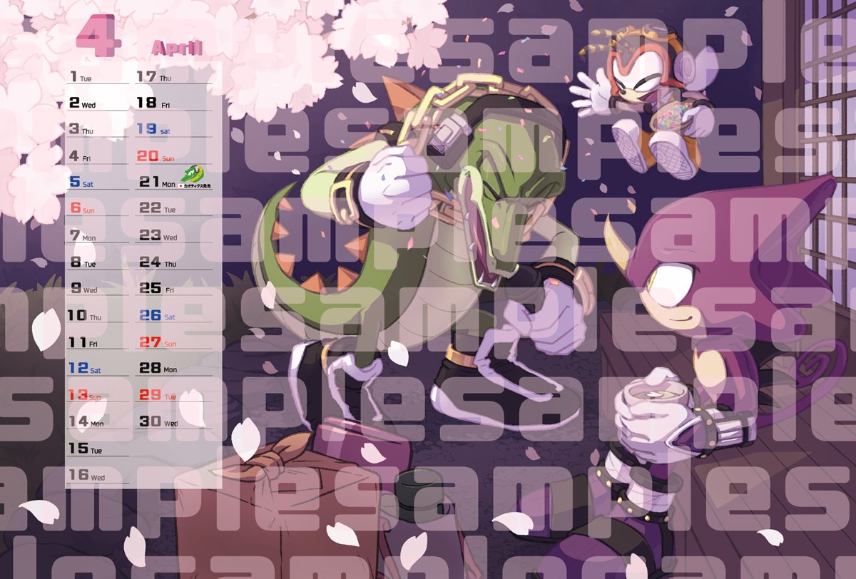 safe38245 artist:apiakus1 charmy bee473 espio the chameleon792 vector the crocodile300 series:sonic fan calendar 202513 20244513 cherry blossom petals23 cherry blossom tree20 confetti40 cup83 eyes closed4814 holding something3708 indoors421 looking at them2273 mouth open5923 obtrusive watermark207 sitting2419 smile14496 standing11111 team chaotix103 tree455 trio1834 watermark587