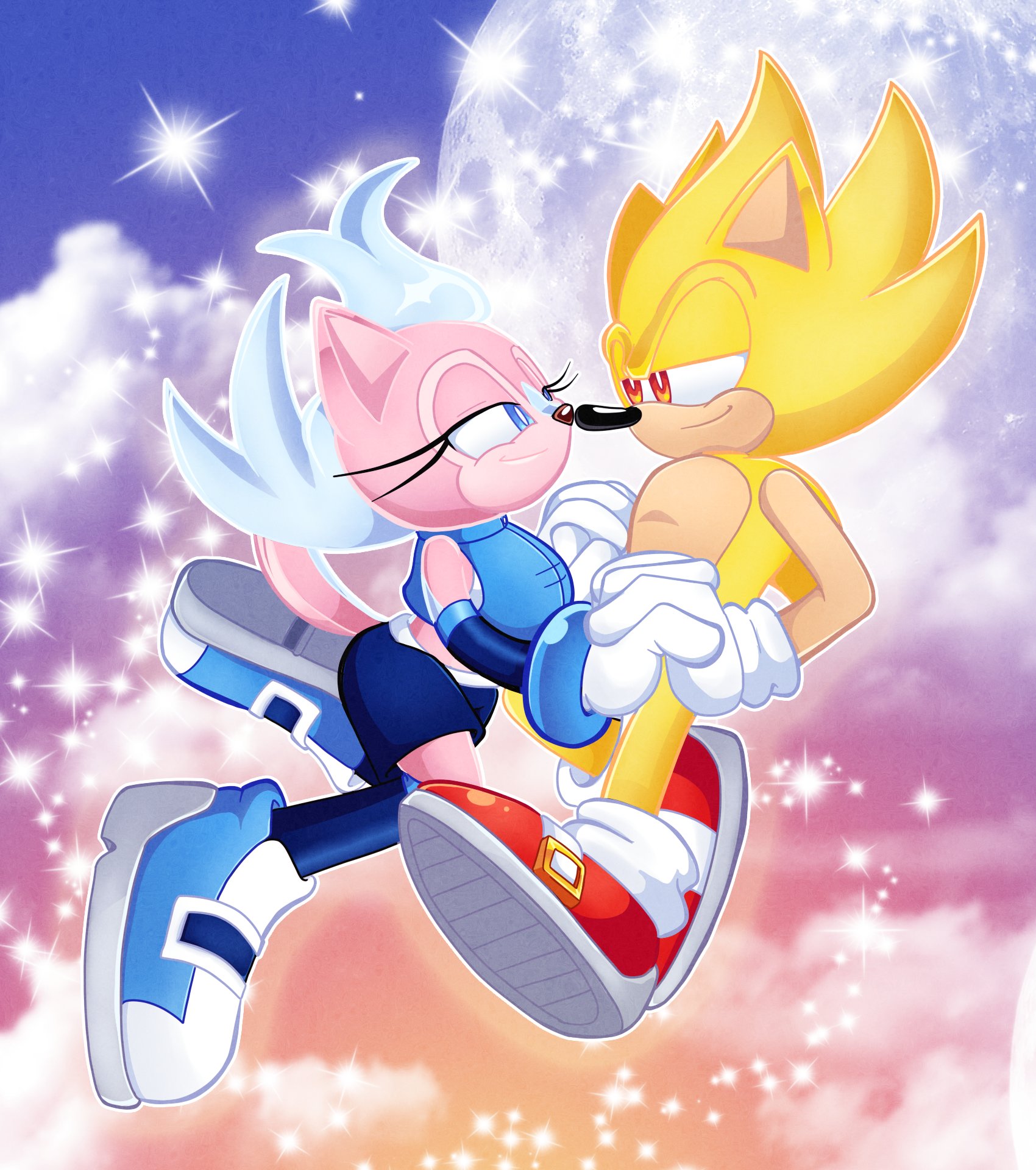 safe38695 artist:tvict10112 sally acorn1553 sonic the hedgehog14220 super sonic610 chipmunk934 hedgehog7850 20221496 clouds984 duo13045 female6964 floating44 holding hands1671 looking at viewer8648 male7134 moon215 sally x sonic507 sally's ringblader outfit305 shipping10359 sparkles1069 straight1760 super form1005 super sally4