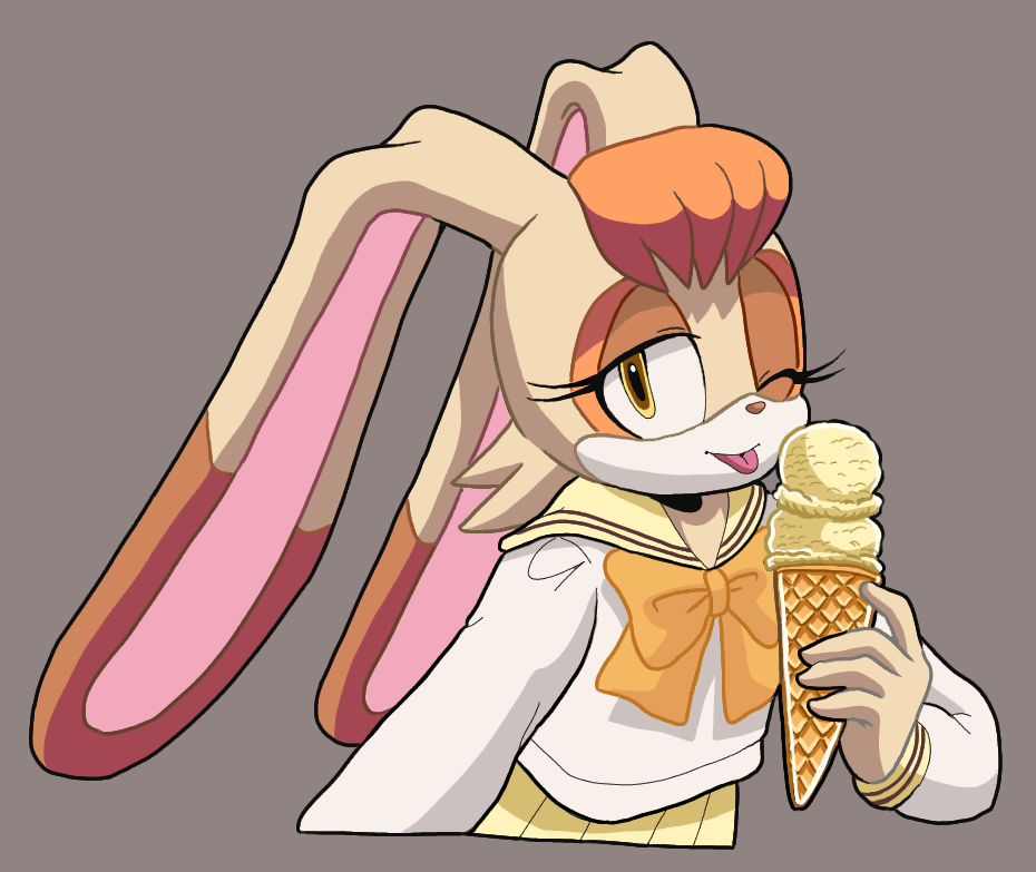 safe39208 artist:sonicfan202623 vanilla the rabbit229 rabbit663 20244590 alternate outfit1438 clothes1972 female7098 food543 grey background2589 holding something3988 ice cream127 ice cream cone4 lidded eyes4346 looking at viewer8951 schoolgirl outfit85 simple background16615 smile15292 solo18082 tongue out914 wink1225