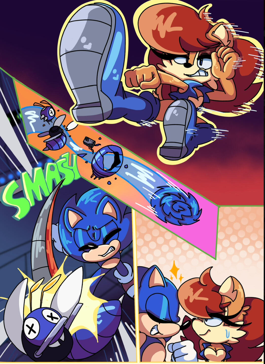 safe39319 artist:maliahboon3 sally acorn1687 sonic the hedgehog14507 chipmunk1065 hedgehog8075 2026693 badnik114 comic880 destroyed robot6 duo13459 english text4645 eyes closed5005 female7166 fighting26 kicking53 male7282 robot1137 sally x sonic587 sally's vest and boots300 shipping10645 sparkles1087 straight1921 sweatdrop1265