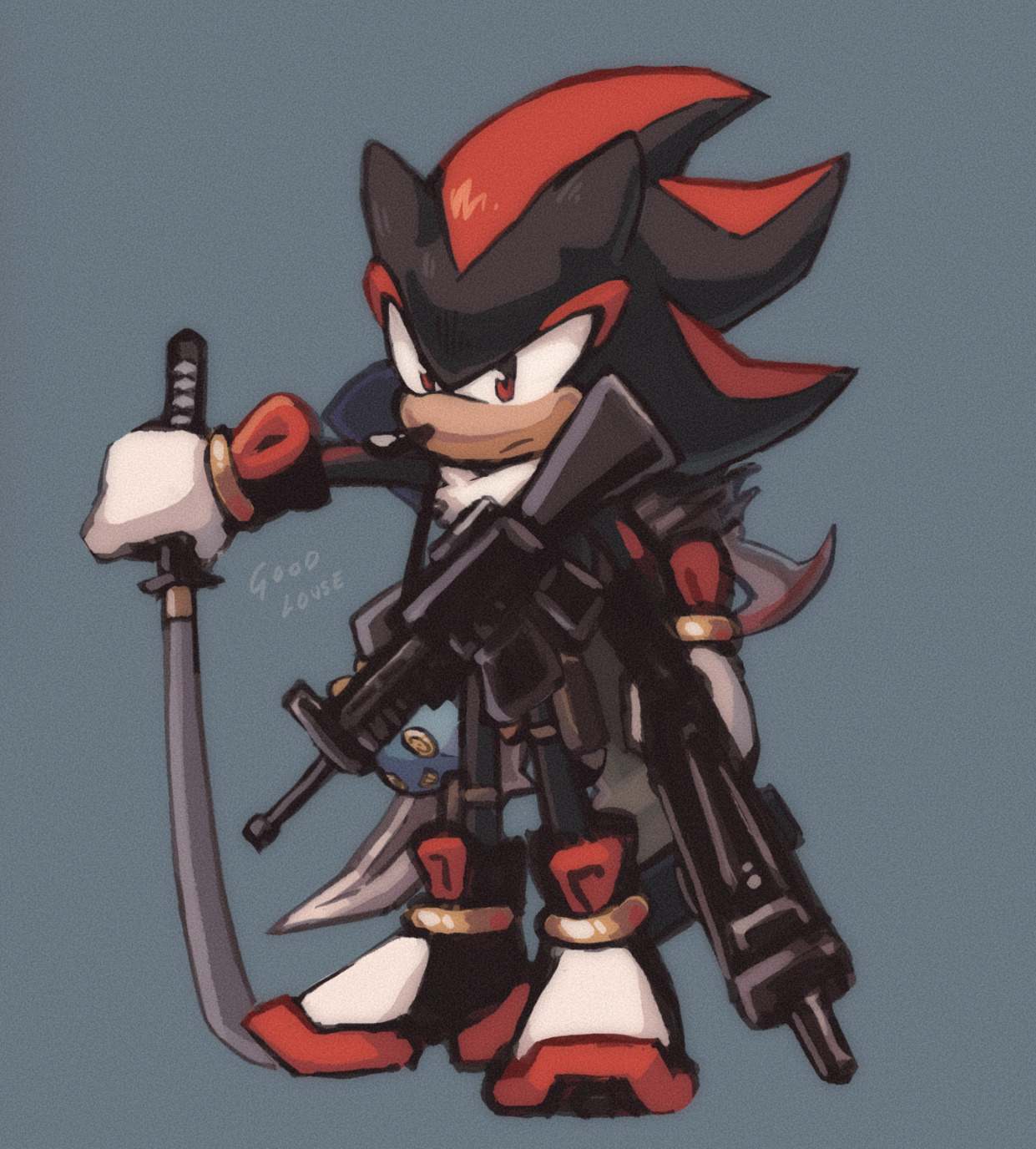 safe39663 artist:goodlouse2 shadow the hedgehog6753 hedgehog8305 20254257 blue background750 frown5059 gun366 holding something4075 katana19 looking offscreen4758 male7554 omochao gun2 rifle4 shadow the hedgehog (video game)149 signature6429 simple background16858 solo18332 weapon216