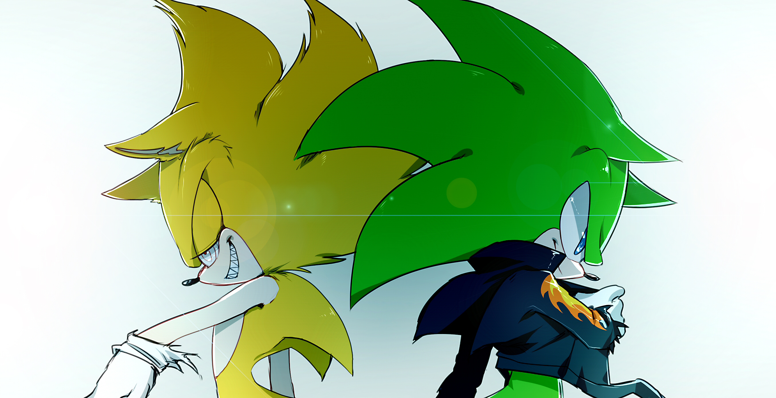 safe34991 artist:darkcrowl7 scourge the hedgehog474 sonic the hedgehog12449 2017636 back to back46 duo11193 fleetway79 fleetway super sonic67 lens flare7 lidded eyes3702 looking offscreen4046 missing accessory34 self paradox373 sharp teeth310 side view112 simple background13921 smile12906 super form922 white background6621