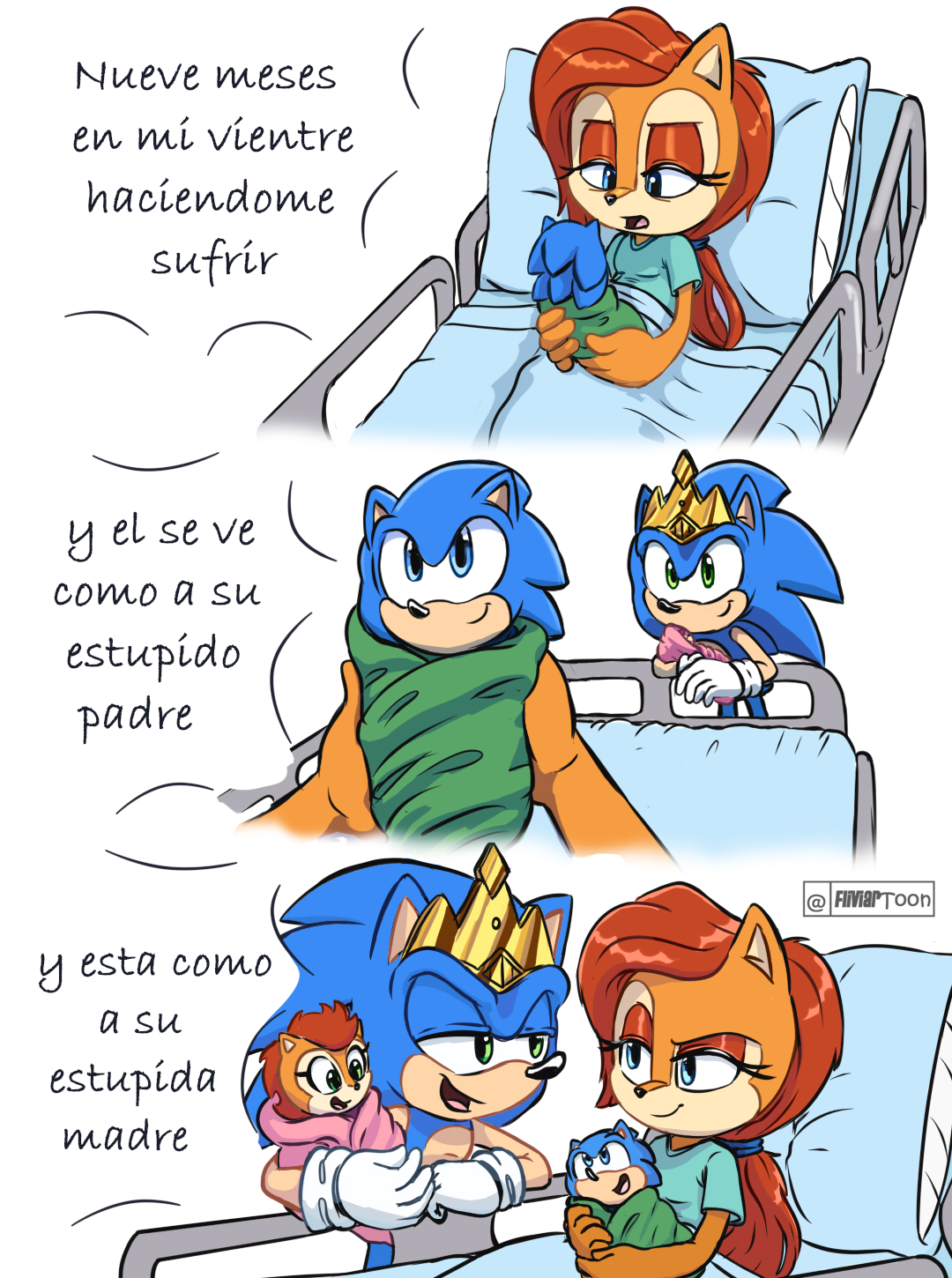 safe35227 artist:fliviartoon12 manik acorn28 sally acorn1141 sonia acorn26 sonic the hedgehog12550 chipmunk442 hedgehog6755 20252681 baby113 carrying them688 comic632 crown88 dialogue2503 nine months in my womb6 ponytail120 quartet66 sally x sonic195 shipping9348 spanish text51 straight1136
