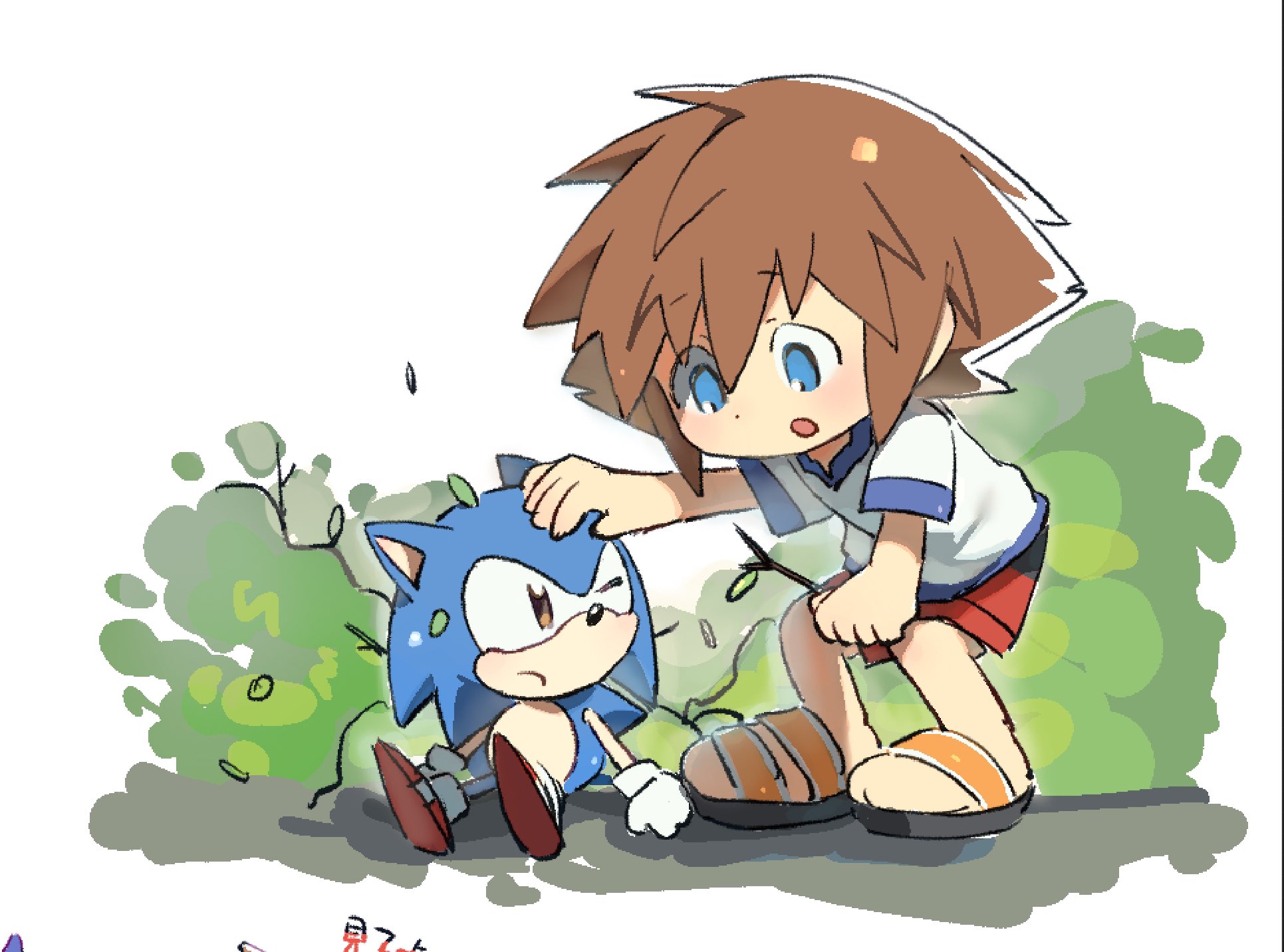 safe35637 artist:neku_646611101 sonic the hedgehog12780 human1978 20252941 classic sonic932 crossover851 cute5534 duo11449 hand on another's head152 kingdom hearts8 looking at each other2521 looking at them1938 simple background14262 sitting2087 sonabetes786 sora (kingdom hearts)7 standing10151 white background6825