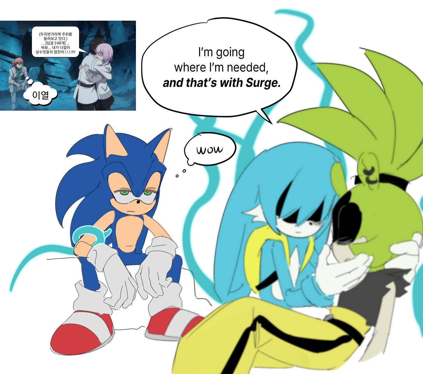 safe36281 artist:guitar_00000001152 kit the fennec549 sonic the hedgehog13072 surge the tenrec649 hedgehog7235 tenrec206 20253230 english text4141 female6015 fennec174 korean text216 lidded eyes3850 male6305 reference inset498 simple background14744 sitting2160 speech bubble1331 thought bubble202 trio1698 white background7160