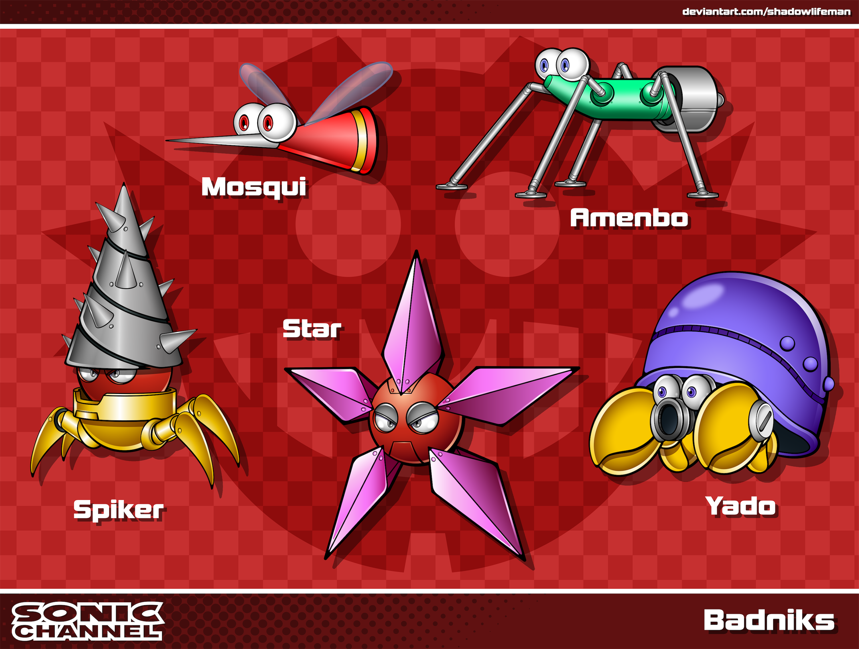 safe36242 artist:shadowlifeman33 2021813 agender250 agender only22 amenbo1 badnik96 character name973 checkered background118 eggman empire logo40 group1308 looking offscreen4195 mosqui1 robot982 sonic channel style14 spiker3 star (badnik)1 style emulation198 text605 yado1