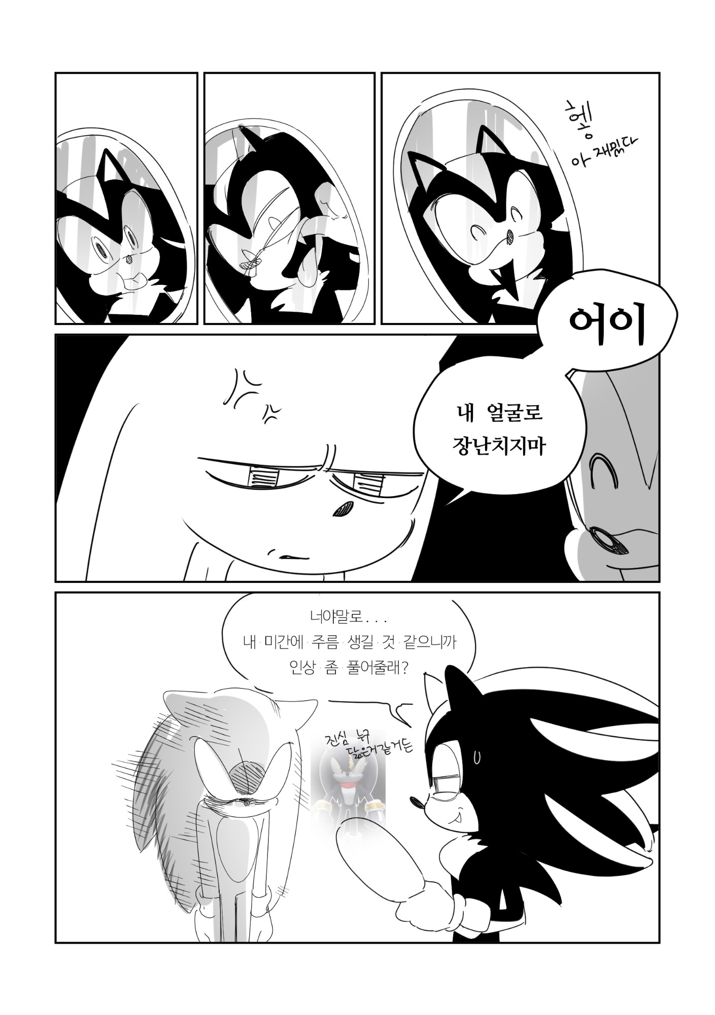 safe36463 artist:guitar_00000001222 shadow the hedgehog6047 sonic the hedgehog13186 20253317 body swap5 comic691 duo11918 greyscale856 korean text248 looking at them2049 mirror24 monochrome2057 reflection42 simple background14837 smile13599 speech bubble1355 standing10424 terios the hedgehog51 white background7230