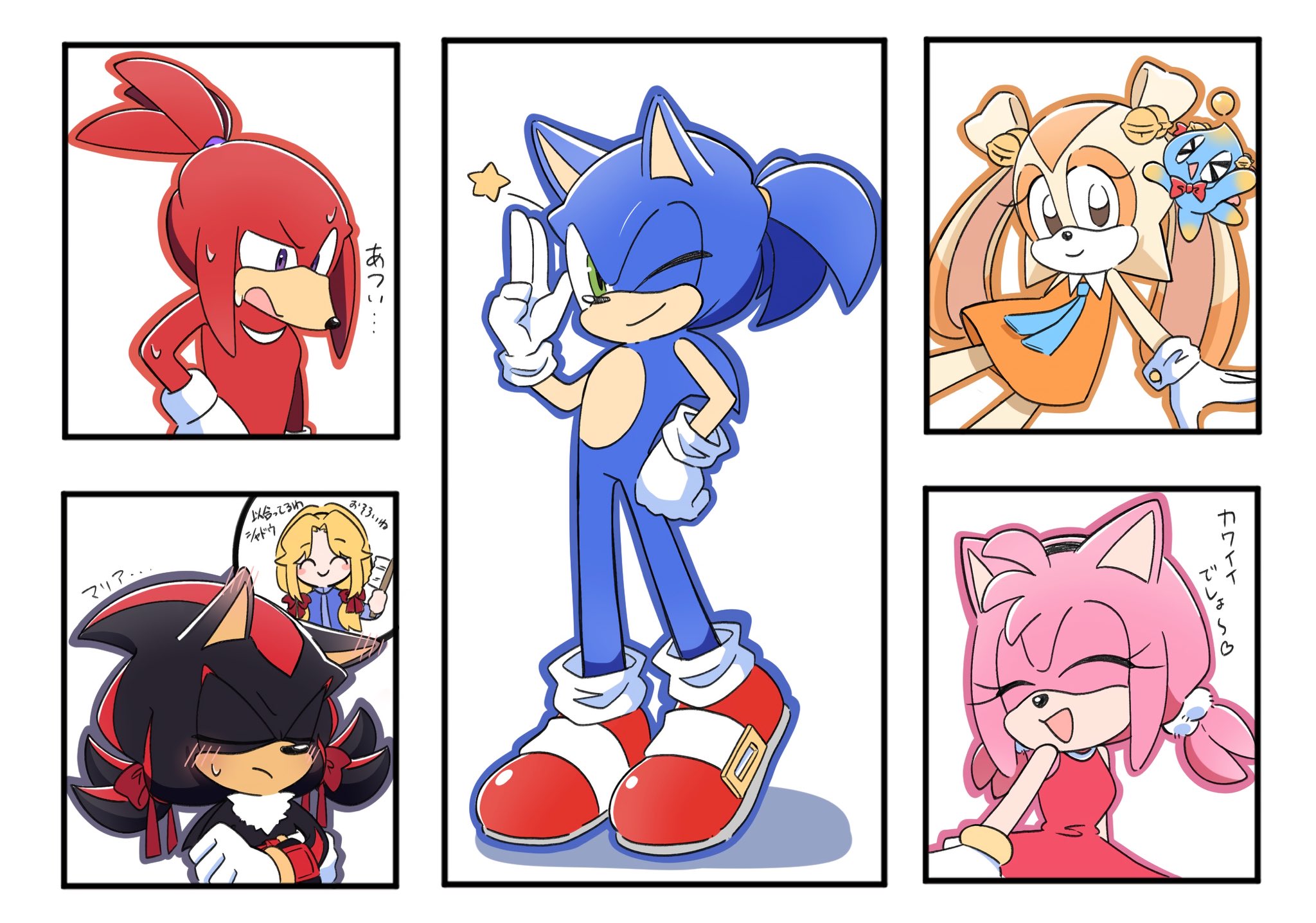 safe36880 artist:oudooooon427121 amy rose5728 cheese (chao)363 cream the rabbit1058 knuckles the echidna2255 maria robotnik424 shadow the hedgehog6135 sonic the hedgehog13427 chao750 human2078 20253473 alternate hairstyle82 blushing6522 eyes closed4630 group1340 hair up36 japanese text443 mouth open5576 neutral chao361 ponytail134 simple background15057 smile13794 standing10581 star (symbol)758 twintails5 white background7378 wink1134