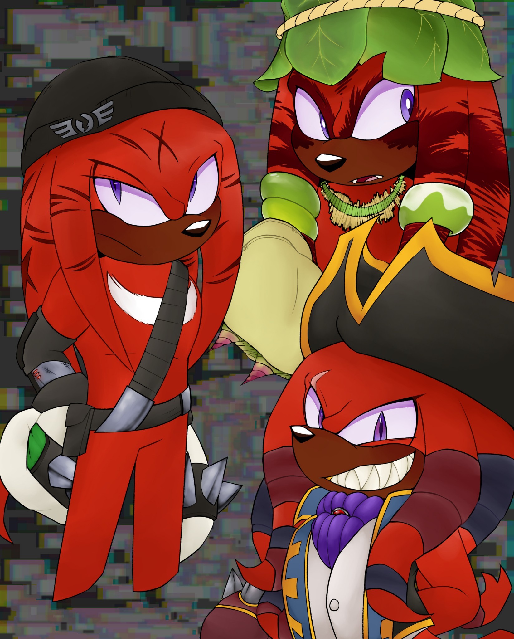 safe36960 artist:renegadeknucks12 knuckles the echidna2265 sonic prime654 20232559 abstract background7003 clenched teeth1869 dark skin364 face paint58 fangs490 frown4586 gnarly knuckles5 knuckles the dread32 looking at viewer8044 looking offscreen4268 renegade knuckles4 scar149 self paradox406 sharp teeth328 smile13841 standing10614 trio1746