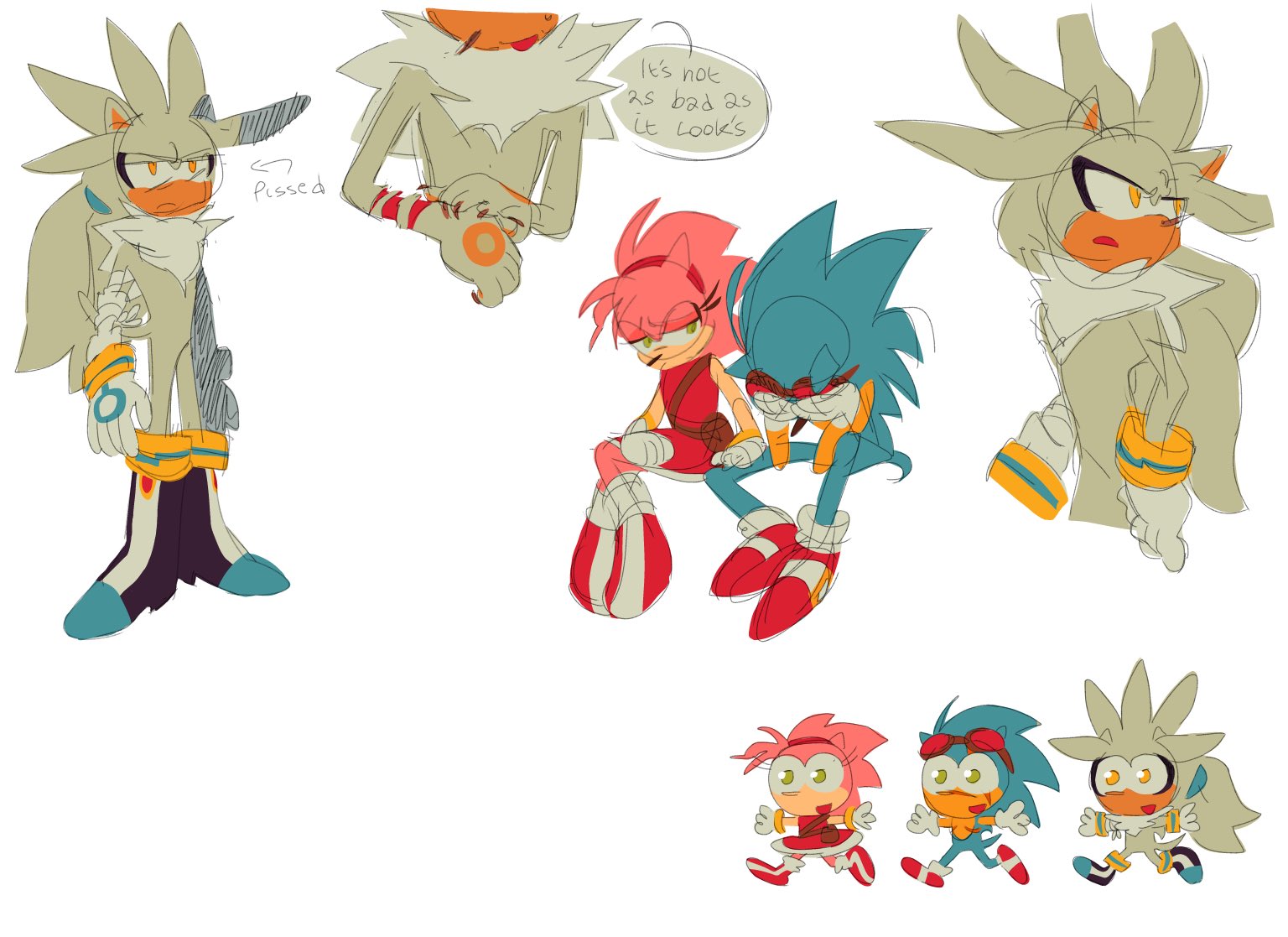 safe37228 artist:funnybonesfunny16 amy rose5767 silver the hedgehog1900 sonic the hedgehog13606 20253611 alternate hairstyle87 alternate universe860 au:dr. prower14 goggles on head354 hands on own face45 injured208 ponytail140 simple background15281 sitting2281 smile13980 speech bubble1441 trio1772 white background7497