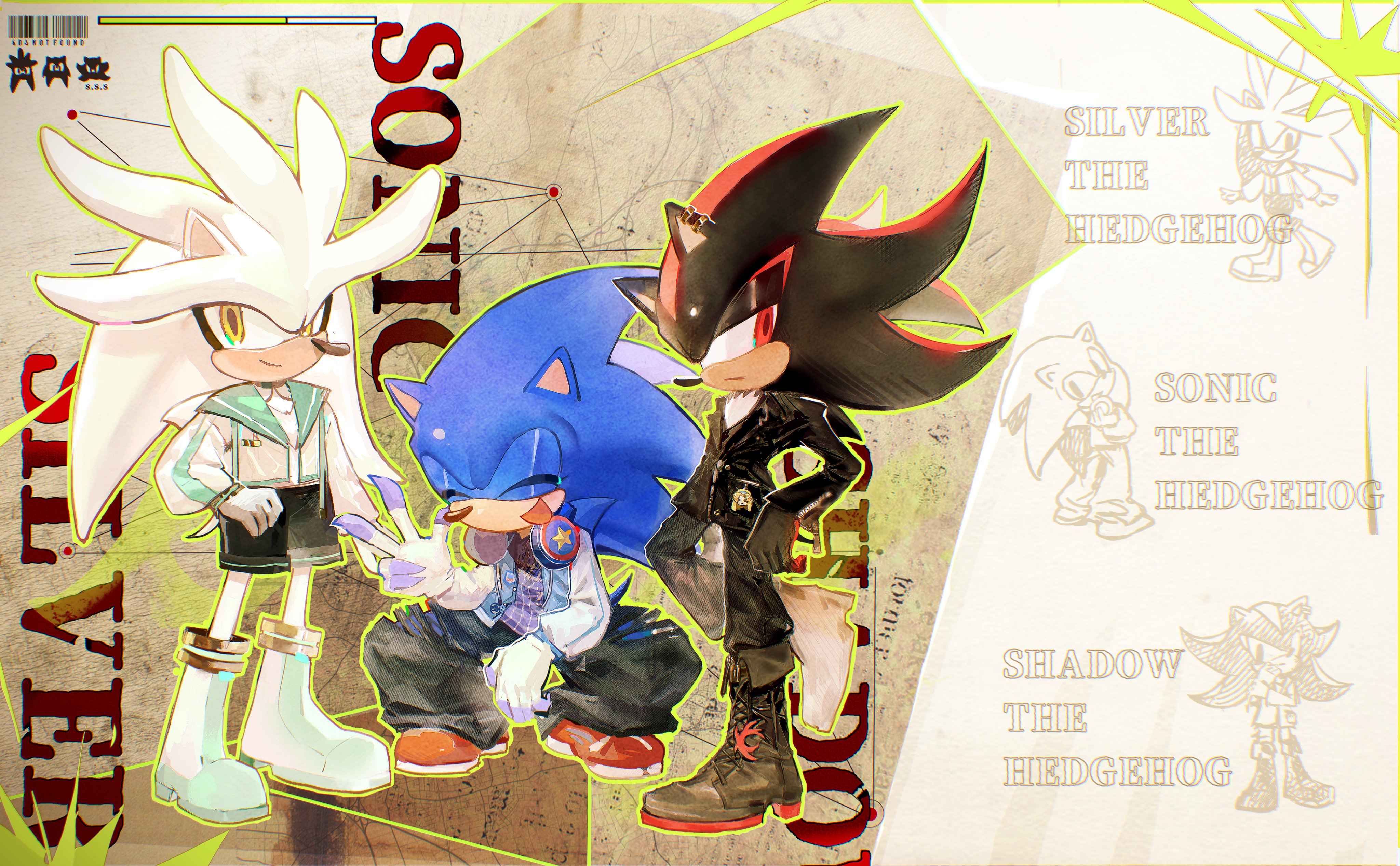 safe37329 artist:waaii13229915 shadow the hedgehog6231 silver the hedgehog1906 sonic the hedgehog13647 hedgehog7473 20253657 alternate outfit1176 character name1004 clothes1691 eyes closed4683 fashion7 fully clothed202 headphones98 headphones around neck13 jacket1055 lidded eyes4009 male6577 mouth open5679 pants519 smile14043 standing10767 trio1784