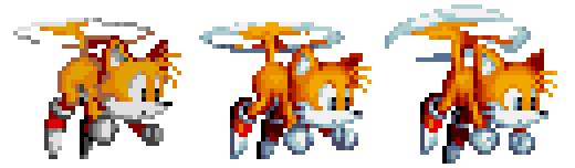 4th Image: New Tails flying animation. Left is Sonic 2, Right is Mania. Middle sprite is my custom edit. There’s something really off about the Mania tails flying animation. It really bothers me. His hands are unclear and seem to have lost the fist shape, his face is small and off model, the tail smear looks sloppy and is at a weird viewing angle, and his legs are droopy and uneven. On top of that, his white stomach fur is missing, and his body shape off — it makes it look like he’s just dangling and given up on life, and not really trying. That said, there’s a lot I do like about the sprite, such as shading, and some details on the head. So I sorta combined some aspects of both games, and redid the tail spin. I also added some detail, like the gust of his tails making his ears flap, as well as feet dangle.