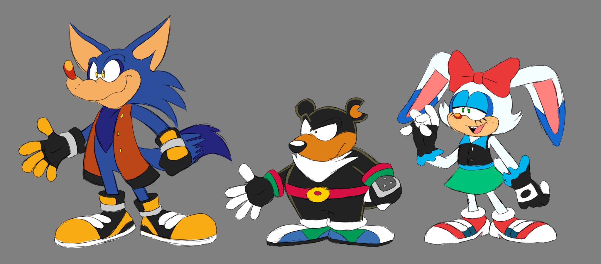 safe37487 artist:theteyoman27 bearenger the grizzly16 carrotia the rabbit23 falke wulf18 bear50 rabbit594 wolf428 2026214 clothes1718 female6257 flat colors1338 frown4668 grey background2405 lidded eyes4042 looking offscreen4350 male6640 modern style53 simple background15444 smile14124 team witchcarter11 trio1789 waving341