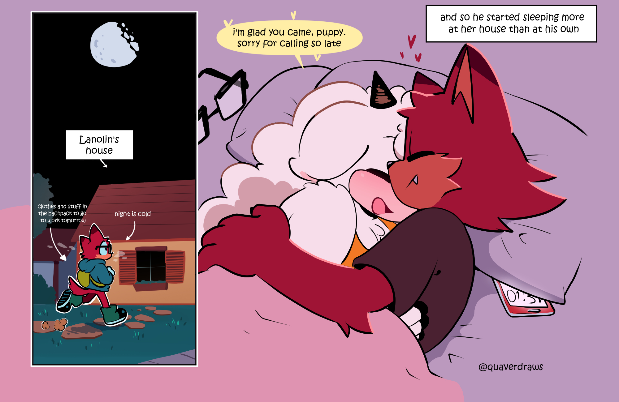 safe37615 artist:quaverdraws29 gadget the wolf248 lanolin the sheep179 sheep73 wolf442 20253748 alternate outfit1205 bag162 bed309 bedroom33 blanket60 carrying something9 clothes1736 comic773 dialogue2660 duo12431 english text4313 female6329 gadget x lanolin27 glasses435 heart3237 hoodie310 house24 lying down522 male6693 moon204 nighttime516 pants532 phone138 pillow158 running628 shipping9928 shirt755 sleeping429 speech bubble1484 straight1497