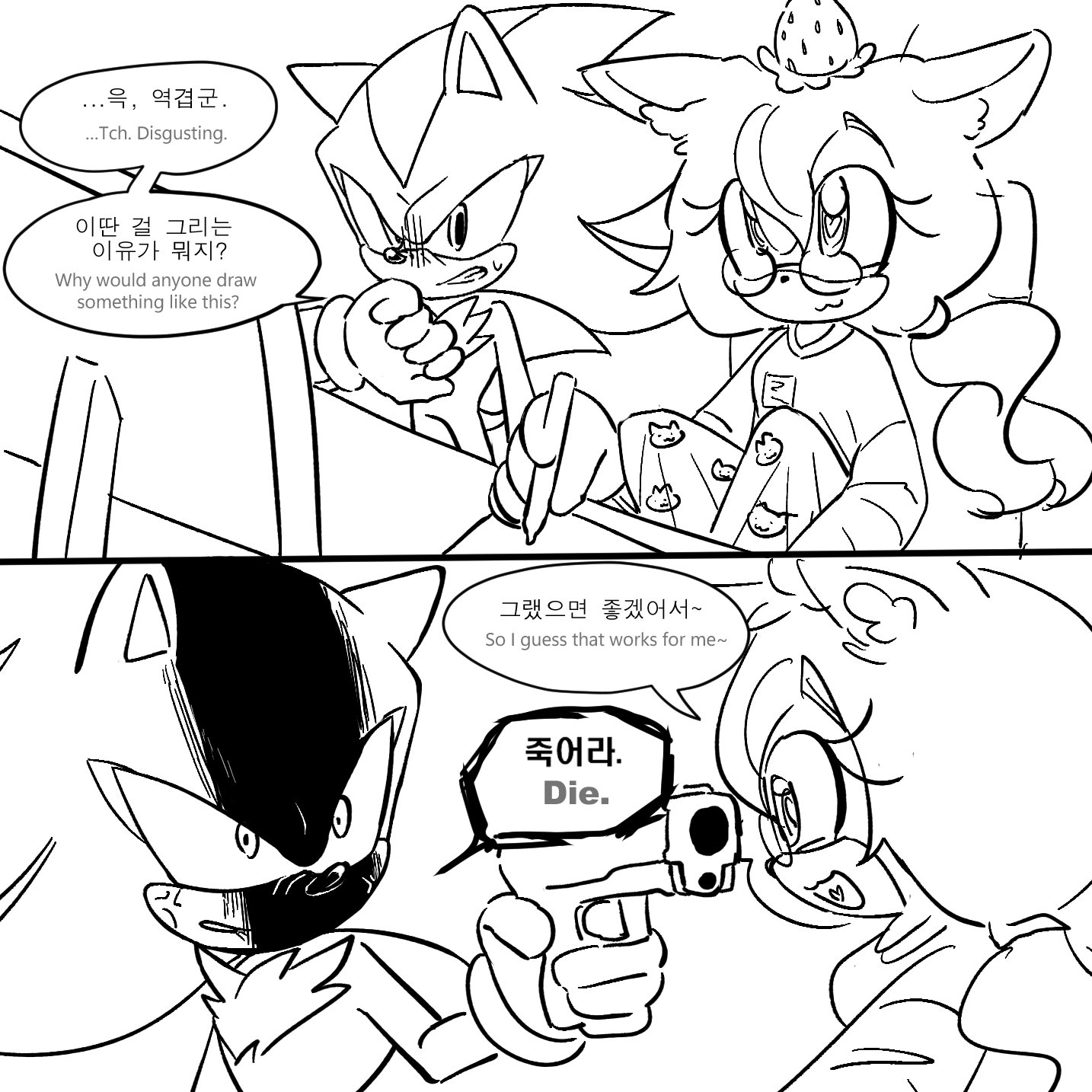 safe37729 artist:tamjeong_sonic317 shadow the hedgehog6343 oc2566 2026264 comic784 disgust7 drawing29 duo12498 english text4328 glasses437 greyscale960 gun339 heart3255 holding something3549 implied gay18 implied shipping21 implied sonadow8 korean text264 looking at each other2747 looking at them2200 monochrome2249 simple background15568 sitting2351 speech bubble1498 white background7653