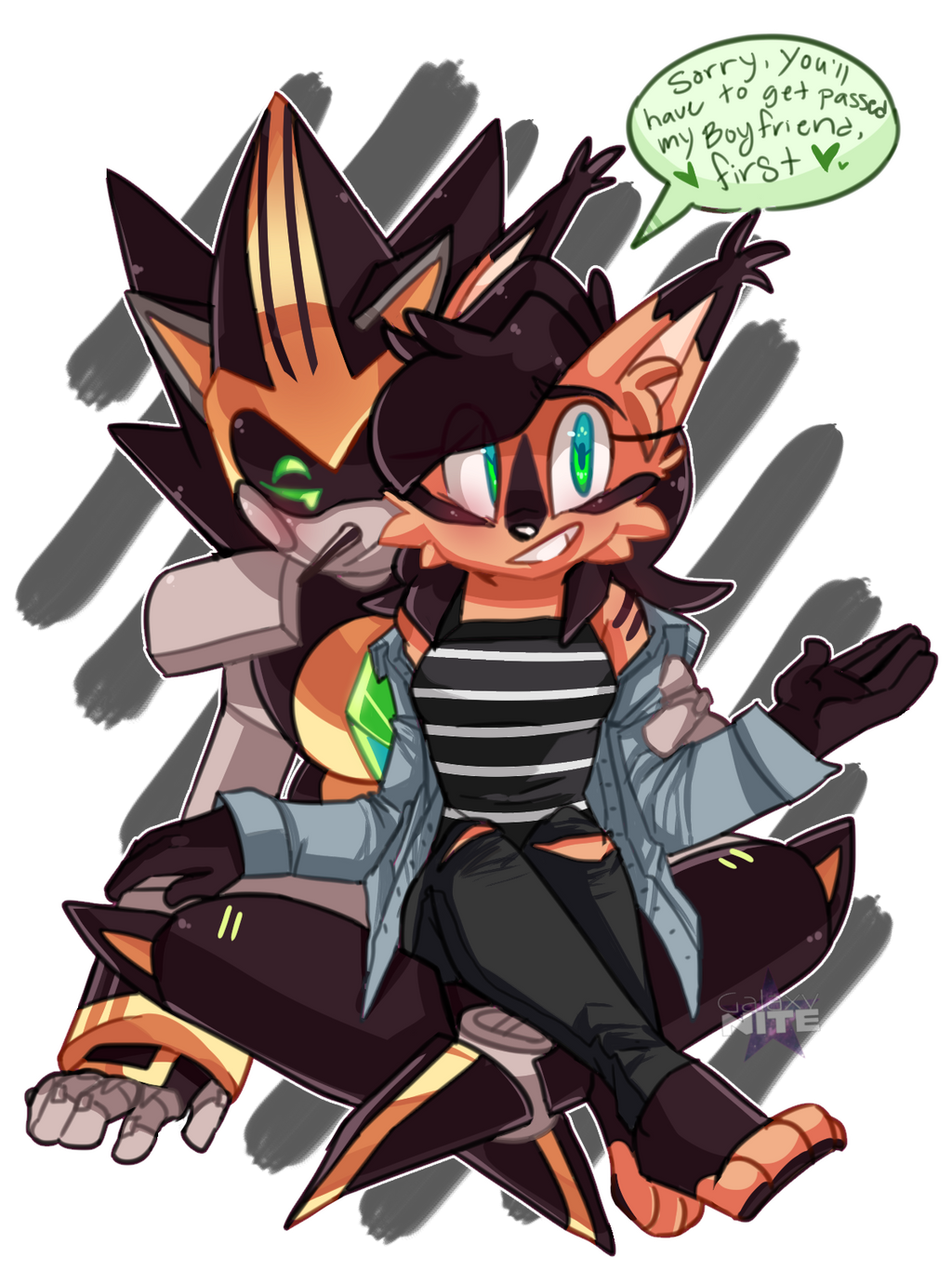 safe37733 artist:galaxynite14 nicole the hololynx342 shard the metal62 lynx113 2018640 alternate outfit1223 blank background9 clothes1756 dialogue2664 duo12501 english text4329 female6372 heart3257 hololynx85 jacket1074 male6752 robot1055 shardicole26 shipping9974 speech bubble1499 straight1523 watermark510