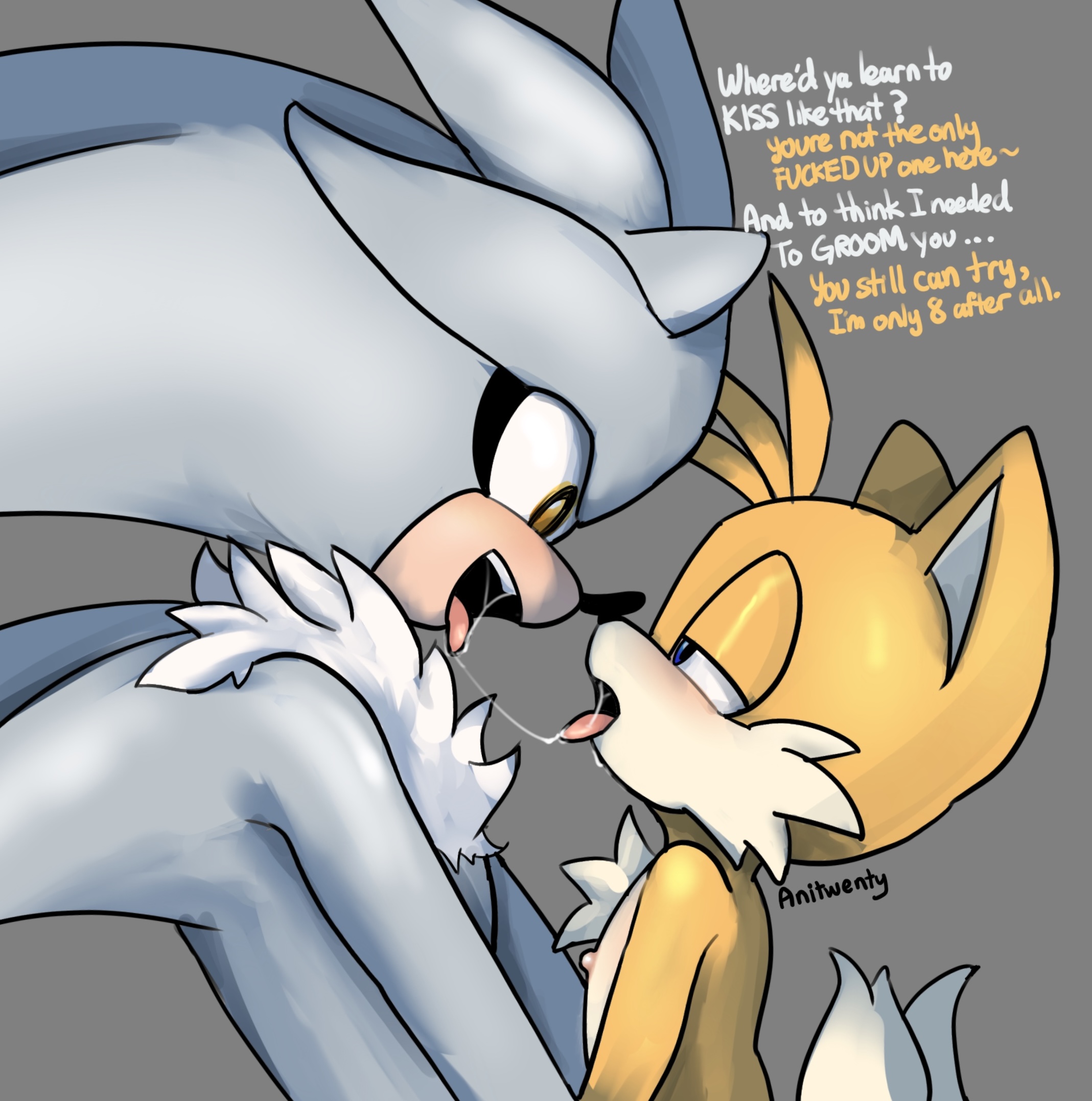 questionable497 artist:anitwenty15 miles "tails" prower9519 silver the hedgehog1987 20254155 after kiss5 age difference601 blushing6936 dialogue2788 duo13186 english text4556 gay5388 grey background2534 lidded eyes4256 looking at each other2887 mouth open6153 nipples472 nudity758 saliva217 saliva trail53 shipping10467 signature6298 silvails49 simple background16340 text890