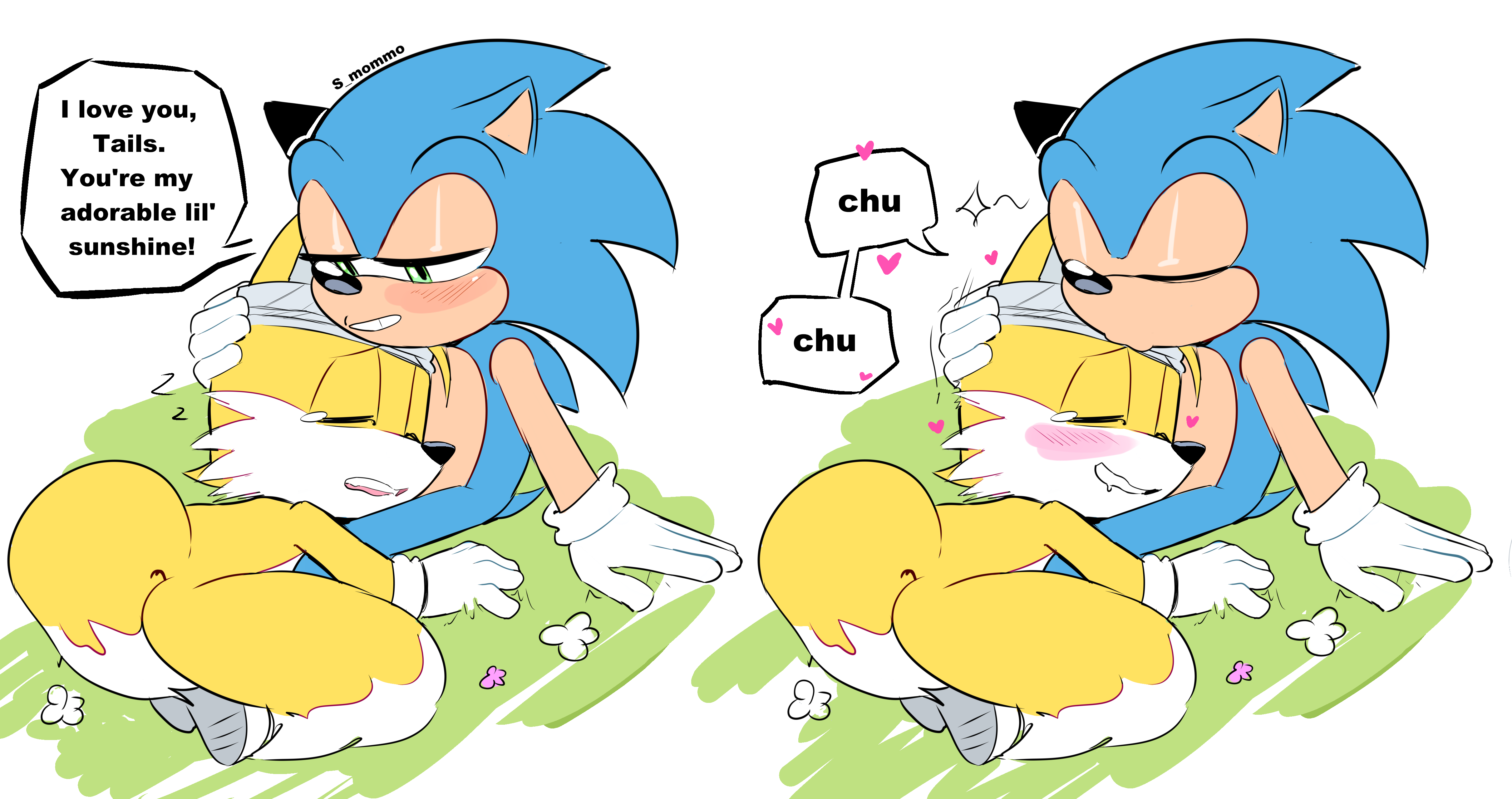 safe38938 artist:smommo5 miles "tails" prower9519 sonic the hedgehog14333 20254155 age difference601 bandage148 blushing6936 chu32 classic sonic1037 classic tails613 comforting79 cuddling69 dialogue2788 duo13186 english text4556 eyes closed4923 gay5388 grass817 hand on head103 heart3408 injured216 kiss1154 kiss on head82 lidded eyes4256 shipping10467 sitting2500 sonic x tails1322 speech bubble1653 text890 treads270
