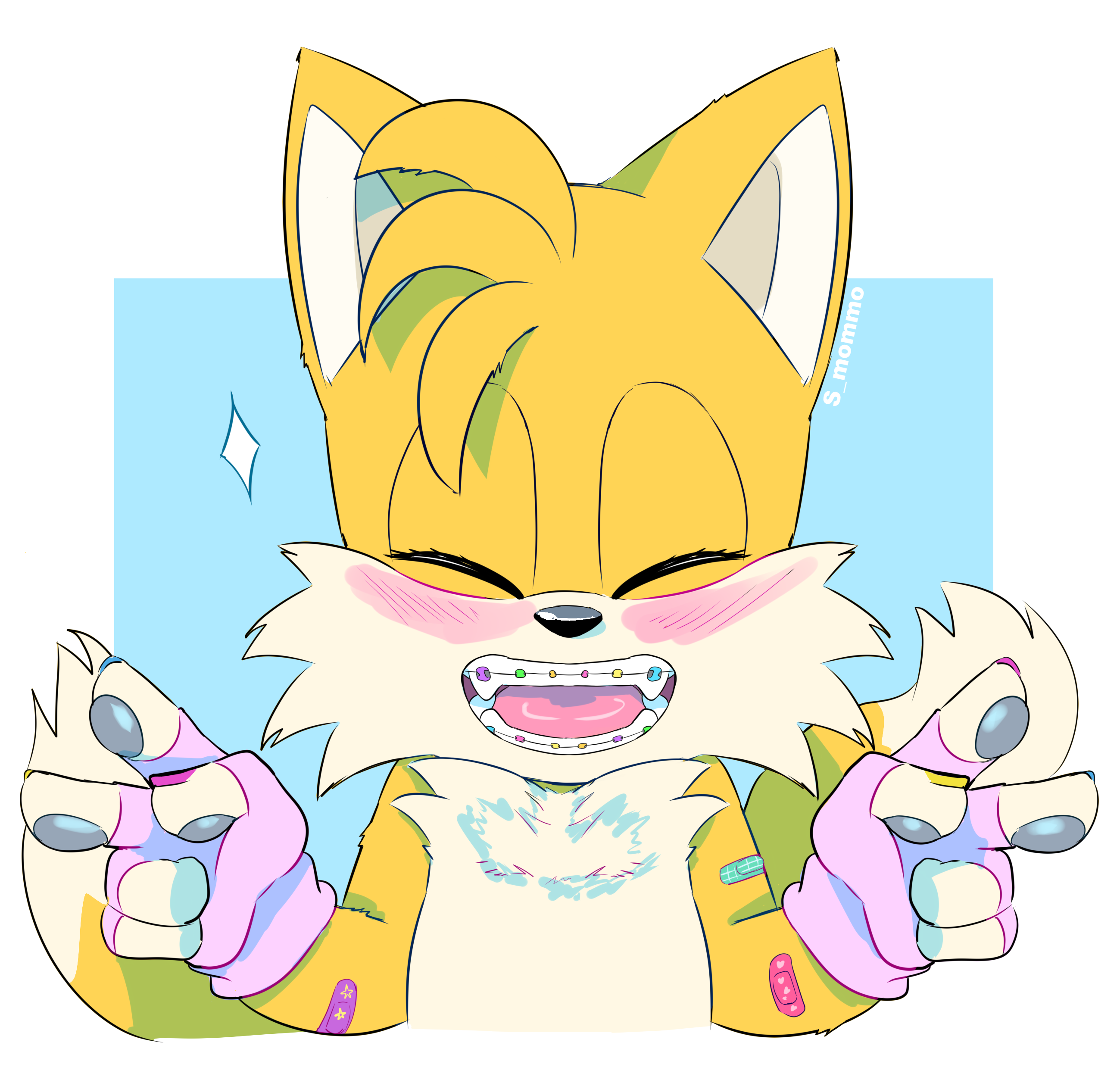 safe38938 artist:smommo5 miles "tails" prower9519 20254155 bandaid117 blushing6936 braces4 bust415 claws529 cute5808 double v sign129 eyes closed4923 fingerless gloves769 gloves1791 mouth open6153 open smile1110 pawpads273 smile14963 solo17816 sparkle42 v sign1111