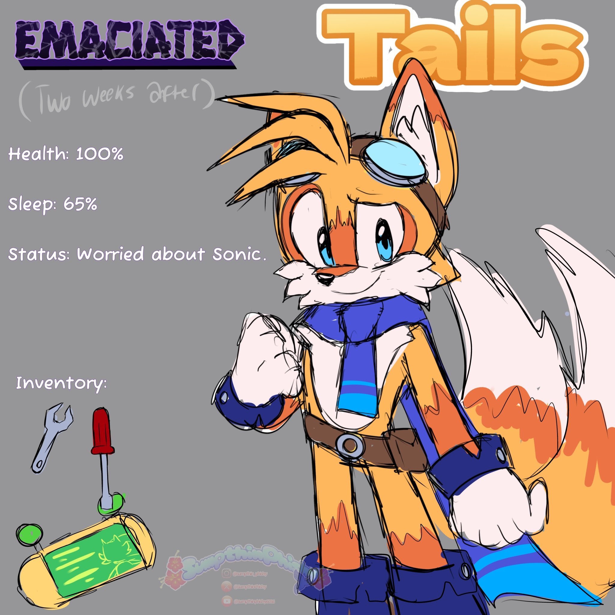 safe39608 artist:sumpthinphishy11 miles "tails" prower9616 fox2731 20254247 alternate outfit1473 alternate version724 au:sonic emaciated3 belt458 boots1000 character sheet102 clenched fists697 clothes2026 ear fluff770 english text4695 eyewear on head115 flat colors1523 fur markings277 gloves1821 goggles887 goggles around neck28 grey background2622 male7512 miles electric77 scarf610 screwdriver37 simple background16820 smile15553 solo18304 standing11626 text1017 wrench207