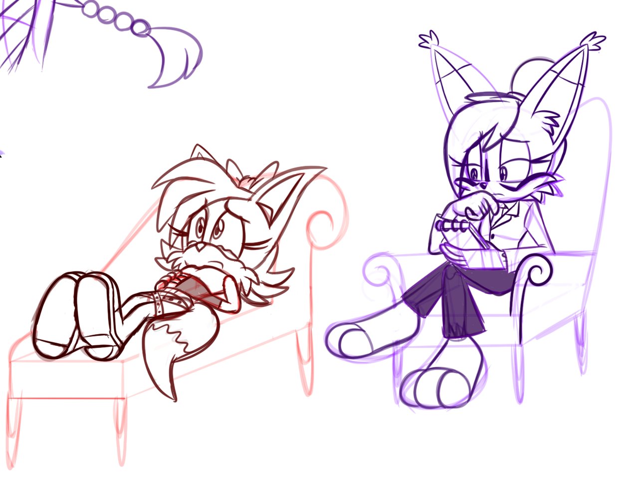 safe40048 artist:doc_animator_n3 fiona fox191 nicole the hololynx407 fox2821 lynx169 2026940 alternate outfit1521 black and white179 chair123 clothes2116 colorless1 duo13891 female7529 legs crossed100 lying down644 simple background17155 sitting2697 therapy3 trauma3 white background8437