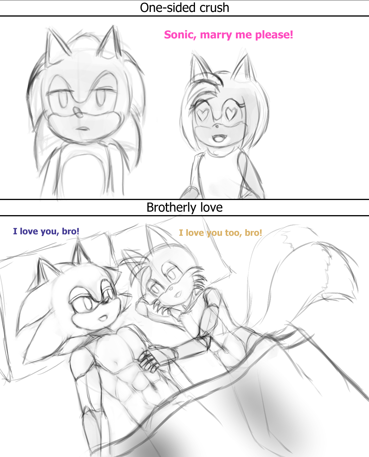 safe40359 artist:pantsulover2281 amy rose6130 miles "tails" prower9820 sonic the hedgehog14930 20261013 abs32 bed389 dialogue2987 english text4897 gay5581 heart eyes118 monochrome2534 nipples585 shipping11092 shipping denied47 simple background17378 sketch2004 sonic x tails1403 text1180 trio2008 white background8543