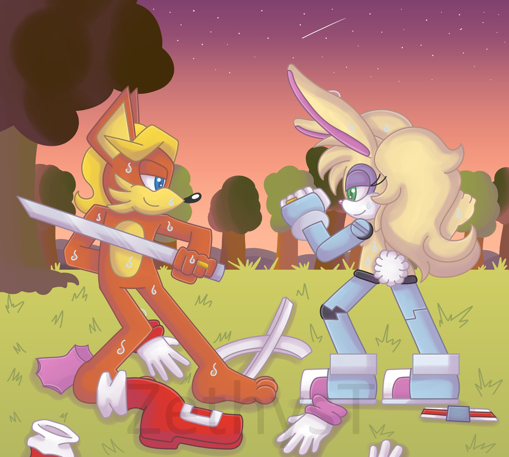 In the evening, Bunnie was impressed with Antoine while seeing him training himself with his sword in the forest. She decided to join his husband and they agreed to train each other with his sword and her martials. The couple also took all their attires off and got completely bare so they were getting more heat for their training.